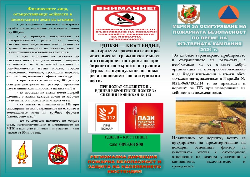 РДПБЗН - Кюстендил се обръща към населението на областта да проявява висока гражданска съвест и отговорност по време на прибиране на зърното и тревния пожар за недопускане на пожари.