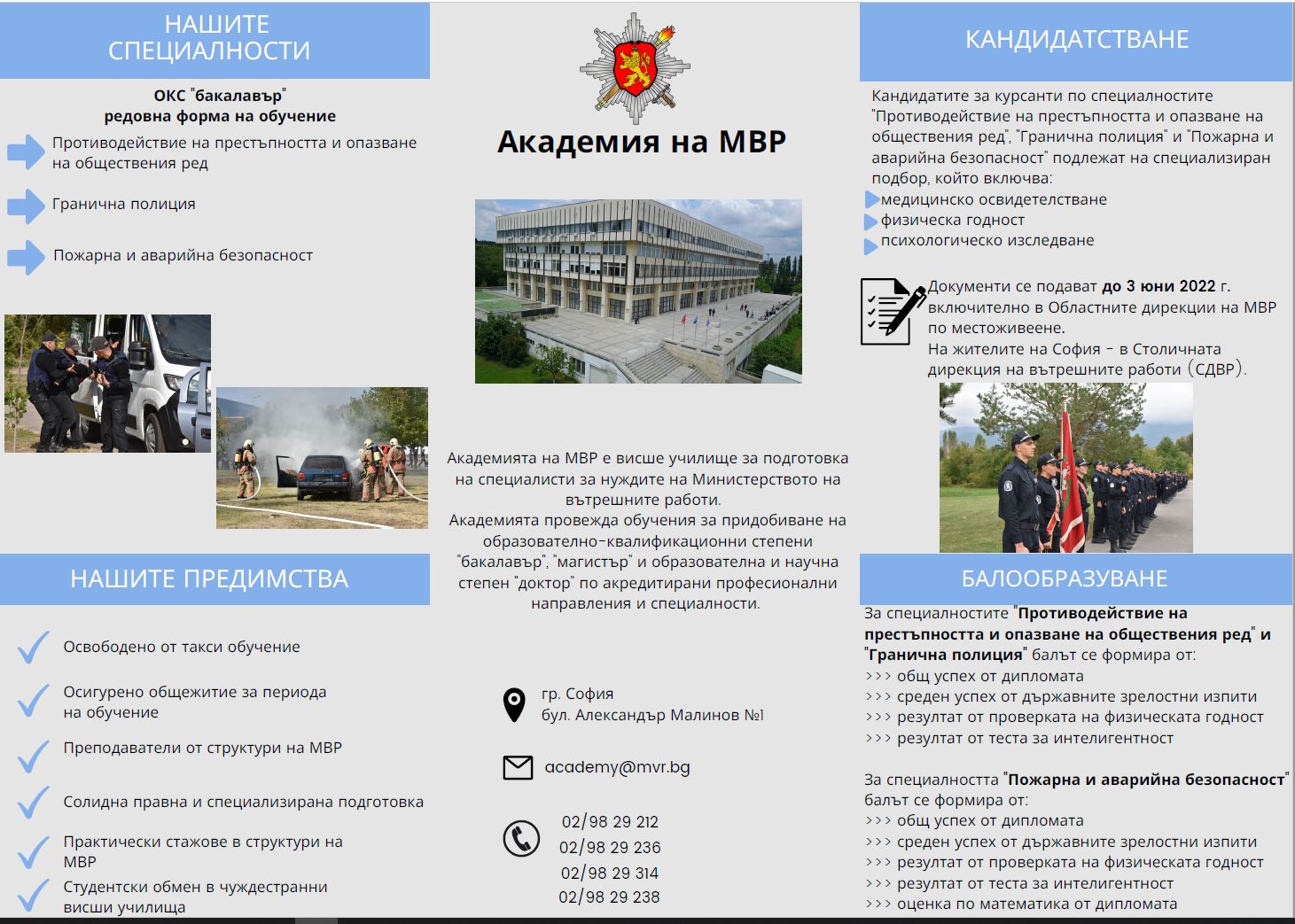Предоставяме Ви материали за възможностите за обучение, условията и реда за кандидатстване в Академията на МВР и Предимствата и отговорността в работата на служителите в системата на Министерството на вътрешните работи.