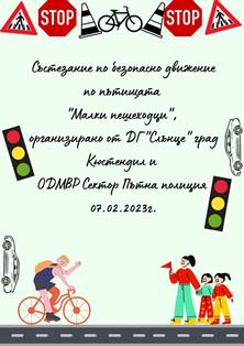 Обучението, осъществено от педагозите в детското заведение и пътни полицаи от ОДМВР – Кюстендил, завърши със състезание. Малките пешеходци показаха познания в три кръга – вече знаят правилата за безопасно участие в движението – като пешеходци, като пътници в автомобила, знаят, че улицата не е място за игра, пътното платно се пресича само на пешеходна пътека и при зелен сигнал на светофара, демонстрираха познаване на пътните знаци и че ползването на обезопасителните колани в автомобила е задължително и за водачите, и за пътниците. За убедителните и активност в състезанието децата бяха наградени с грамоти, връчи им ги инспектор Радослав Стойнев от сектор „Пътна Полиция“ – ОДМВР.