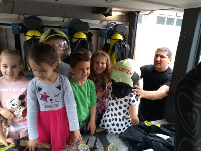 Под ръководството на г-жа Стоянова, децата бяха нарисували картинки и апликации, които подариха на своите домакини. А те ще ги закачат на специално табло редом до рисунки от други малчугани. Всички заедно изрецитираха стихотворение за професията пожарникар. Разделихме се с покана за следващо посещение при огнеборците.