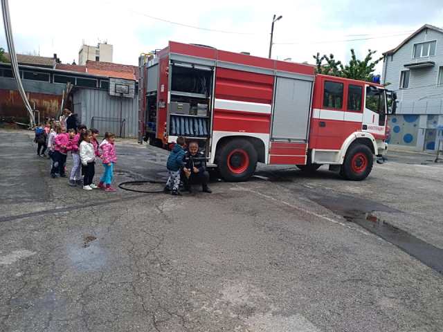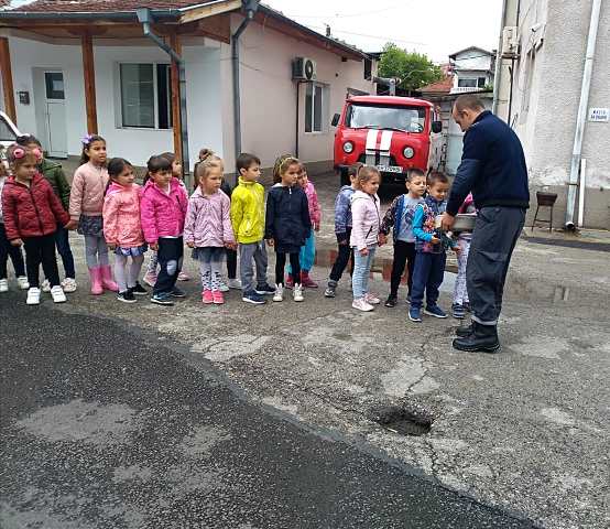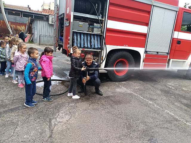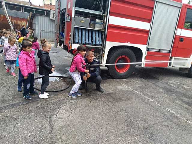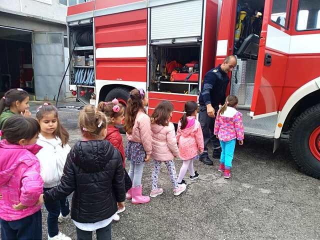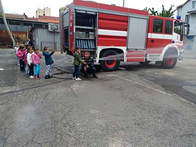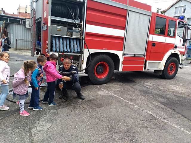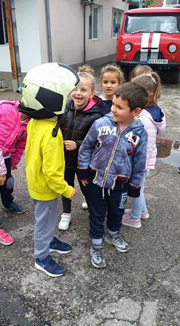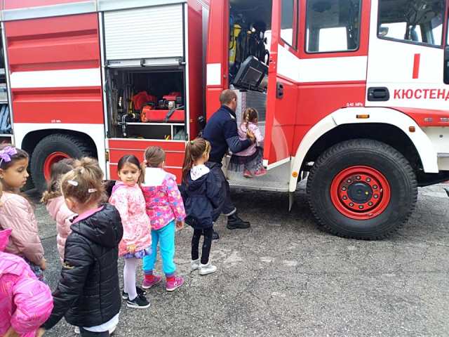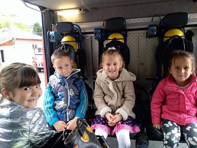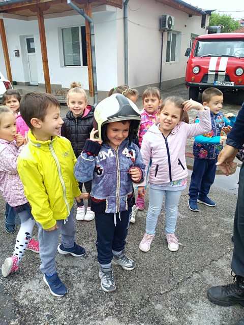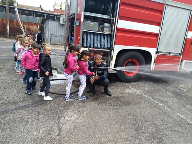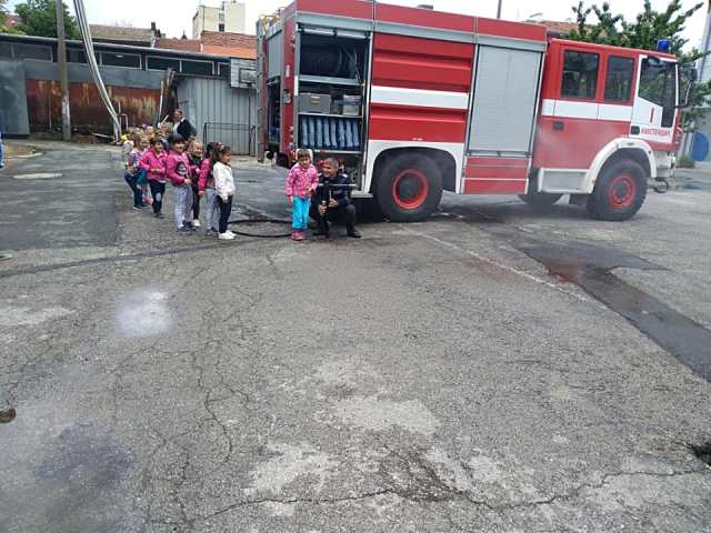 Малките любопитковци разгледаха гаража на противопожарната служба, видяха големите камиони и научиха какво се прави, когато бъде получен сигнал за пожар. Запознаха се и с техниката, с която смелите мъже помагат на хората изпаднали в беда след катастрофа или природно бедствие. Впечатлени от разказите, децата имаха възможност да се качат на пожарникарските коли и с помощта на големите чичковци да "шофират", опитаха тежестта на пожарникарския шлем и с интерес разгледаха цялото защитно облекло. Емоциите нараснаха, когато огнеборците дадоха на малките си гости практически урок как да направляват струята за гасене на пожар.