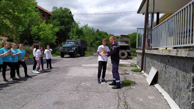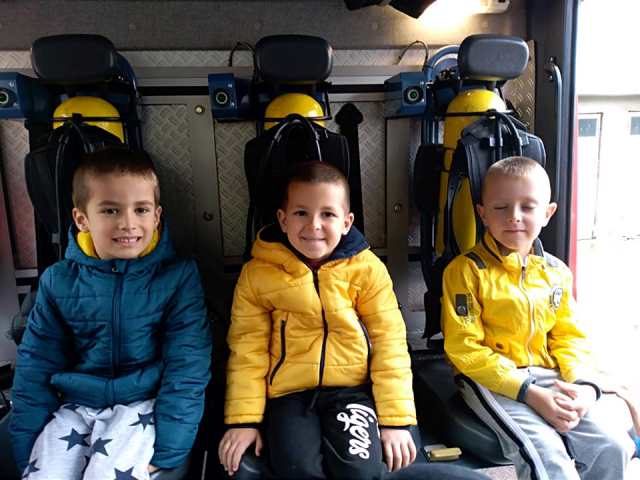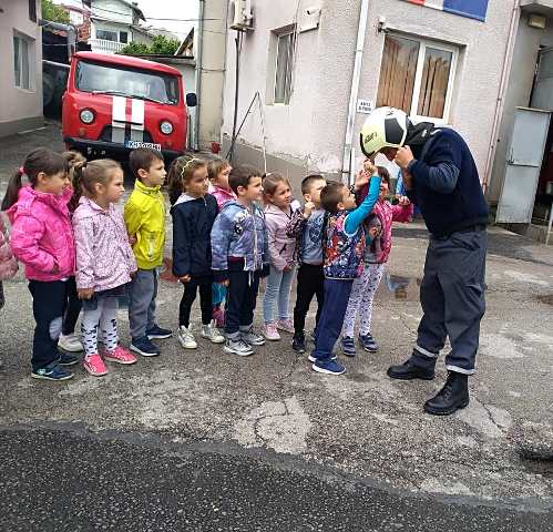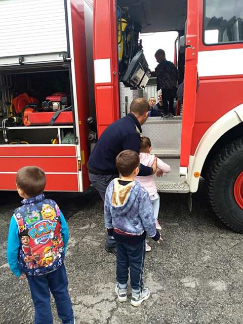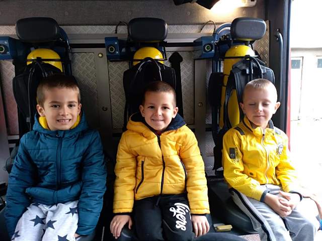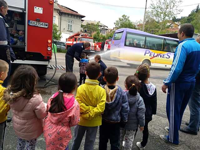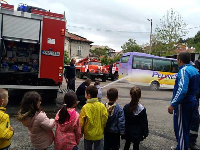 Децата имаха възможност да разгледат гаража на пожарната районна служба, да се качат на пожарен автомобил, да видят отблизо техниката, сирените, светлините, защитните облекла, каска и по този начин да се докоснат до благородната и трудна професия на пожарникаря.