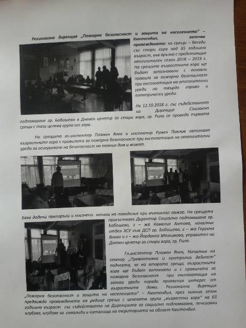 През месец октомври 2018 година служители на РДПБЗН – Кюстендил провеждат срещи с възрастни хора ( над 65 години ), за да обсъдят въпроси на превенцията на пожарите в бита през настоящия зимния сезон - 2018 - 2019 гдина. Първите срещи са проведени в първите дни на втора деседневка на месеца с възрастни хора от общините Рила и Бобошево - 12 октомври.Те се състояха в Дневния център за стари хора в гр. Рила и в гр. Бобошево. На тези срещи присъстваха Директорът на Социално подпомагане - Бобошево - г-жа Камелия Антова, началникът на отдел ХСУ към ДСП - Бобошево - Гергина Янева и управителят на Дневния център за стари хора - Рила - Йорданка Мазникова.