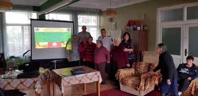 Главен инспектор Пламен Янев – началник на сектор „Превантивна и контролна дейност“ и инспектор Румен Павлов от РДПБЗН запознават възрастните хора с правилата за пожарна безопасност при експлоатация на електрически отоплителни уреди и уреди на твърдо гориво, за осигуряване безопасността на техния живот и дом. Поради проявения интерес за безопасна работа с газови уреди, гл. инспектор П. Янев уточни, че тези въпроси предстои да се обсъждат на втора среща.