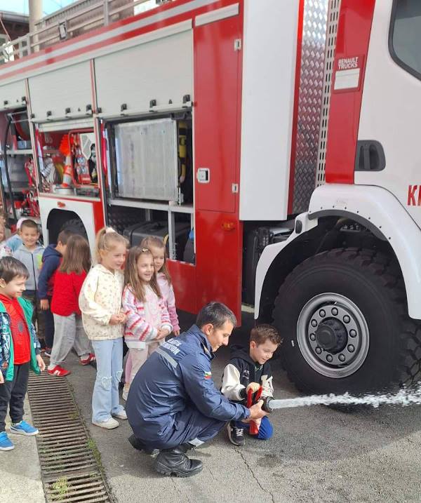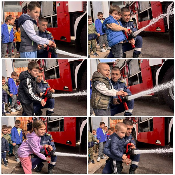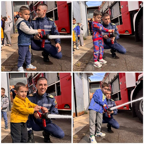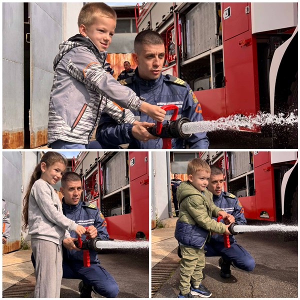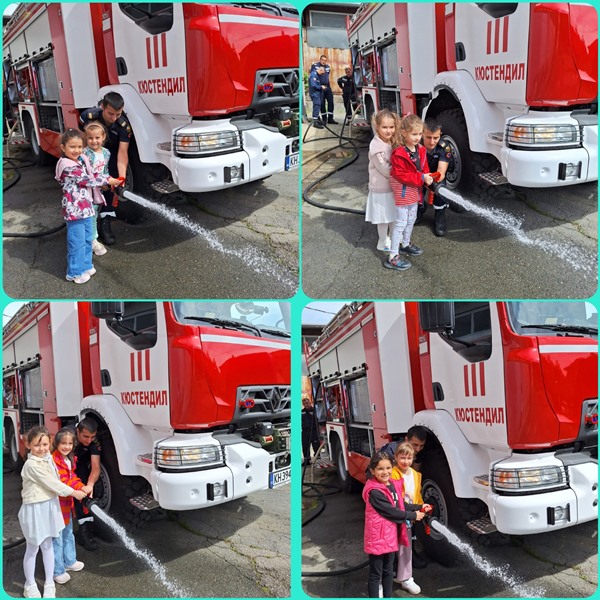 С огромен интерес малчуганите разгледаха специализираната техника, оборудване и екипировка . С помощта на усмихнатите пожарникари , те дори опитаха да пръскат с водната струя  – истинско вълнение и радост!